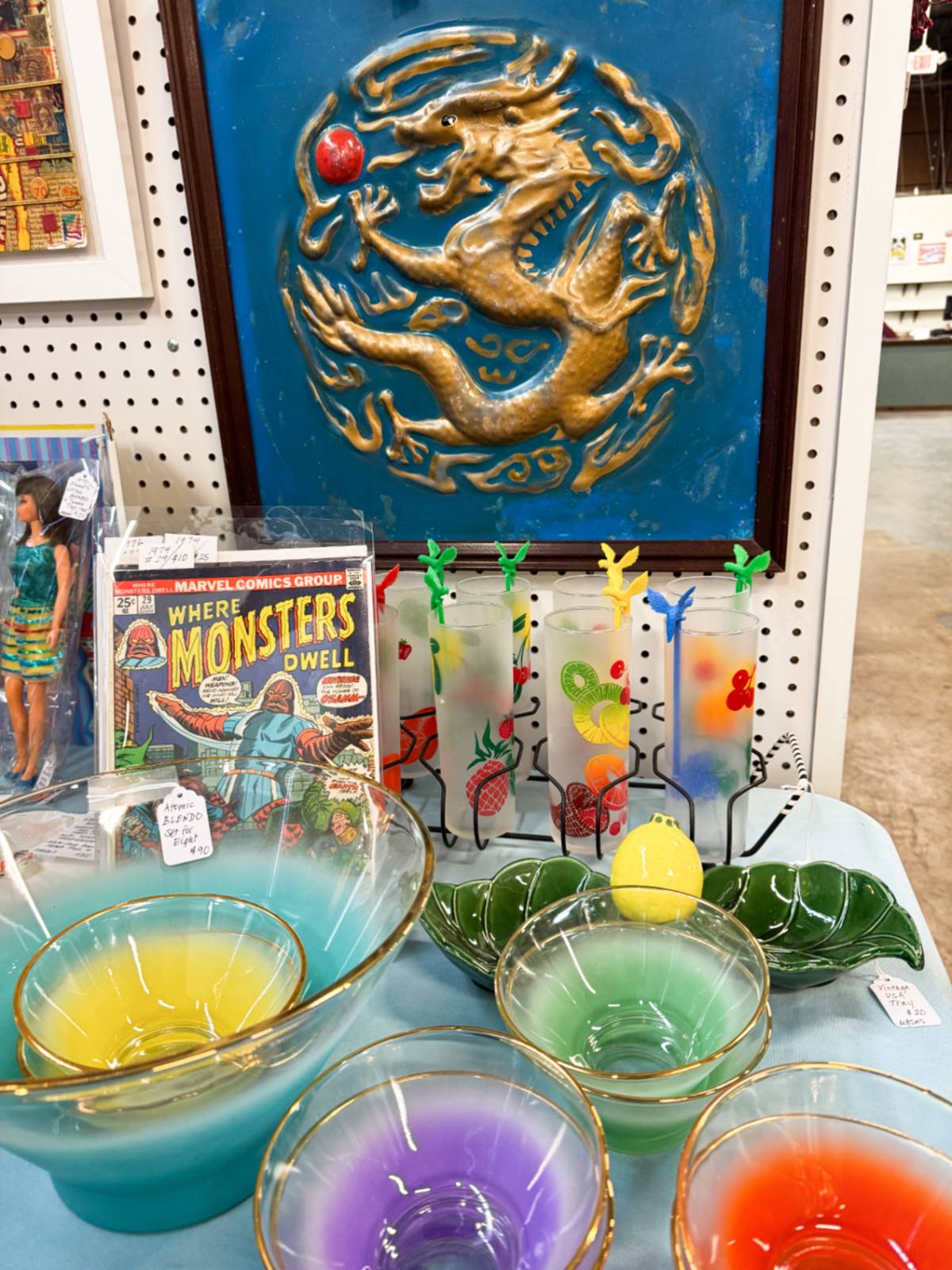 UPDATE Tue. March 10 – SOLD ~ Betsey Johnson sneakers, telephone, pink lemonade glasses. Vintage Barbie & Skipper, tiki tropical fruit glasses. Art Deco chrome cocktail shaker set, Robert Meth martini pitcher set. Blendo five-color bowl set for serving eight.